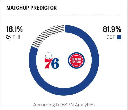ESPN预测明日比赛:活塞胜率81.9%,76人胜率18.1%